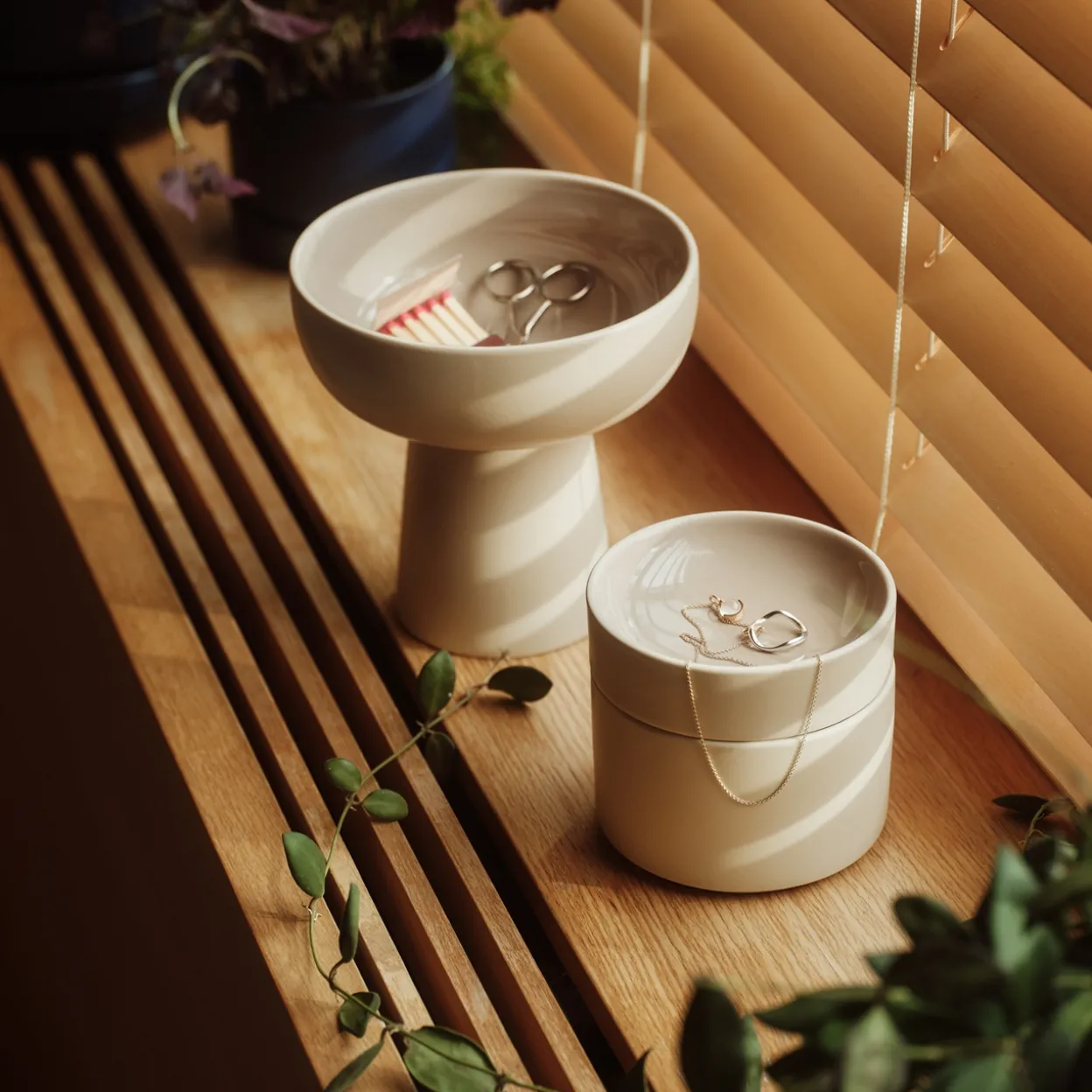 Suomen muinaisten hiidenkirnujen innoittama Kirnu-rasia yhdistää minimalistisen muotoilun ja käsintehdyn lasituksen taidokkuuden. Matan ja kiiltävän pinnan harmoninen yhdistelmä tekee arkisestakin säilytyksestä tyylikästä. Tämä monikäyttöinen rasia tuo ripauksen hienostuneisuutta kodin jokaiseen tilaan.