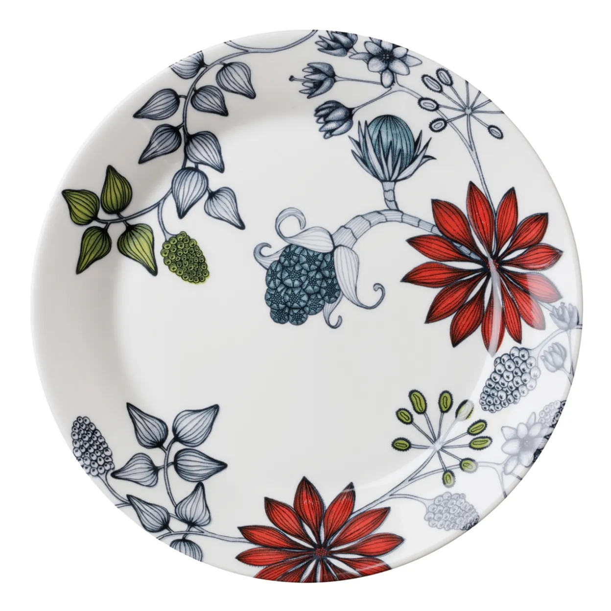 Runo Kesäsäde 26 cm lautanen esittelee Heini Riitahuhdan käsin piirretyn kuvion, joka virtaa saumattomasti lautasen pinnalla. Elinvoimaiset kukat, lehdet ja nuput luovat kauniin kontrastin syvän musteensinisten sävyjen kanssa. Kestävä vitroposliini tekee lautasesta täydellisen niin arkisiin aterioihin kuin juhlahetkiin. Myös loistava lahjaidea.