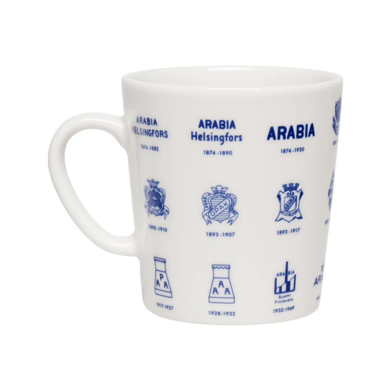 Sininen Arabia Leimat -muki (0,3 L) esittelee Arabian tuotteiden pohjaleimoja aikajärjestyksessä. Nämä leimat kertovat brändin tarinaa vuodesta 1873 alkaen ja juhlistavat yli 150 vuoden mittaista suomalaista muotoiluperinnettä. Kestävä keraaminen muki kestää konepesun, mikroaaltouunin, pakastuksen ja uunin – ihanteellinen arjen käyttöön.